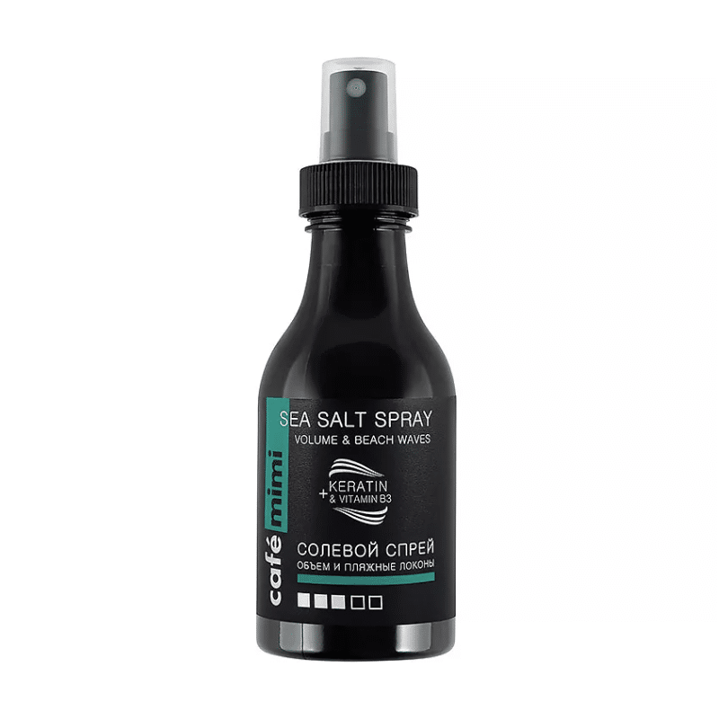 Солевой спрей CAFÉ MIMI с минералами морской соли — идеальное средство для создания непринужденных объемных укладок в «пляжном» стиле. Спрей придает волосам плотность и объем, создает идеальный пляжный образ и обеспечивает легкую надежную фиксацию. Морская соль и кератин оказывают укрепляющее и восстанавливающее действие на структуру волос, придают им жизненную силу и матовый финиш. Экстракт морских водорослей и Витамин B3 питают и увлажняют волосы.
