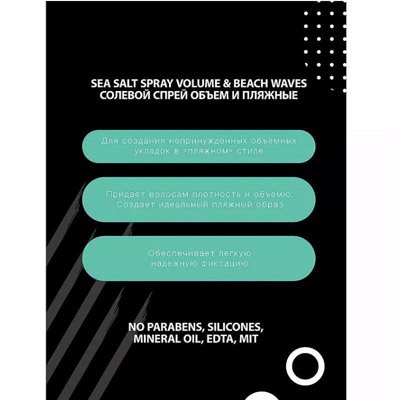 Aqua, Sodium Chloride (Sea Salt) (Морская Соль), Maltodextrin/VP Copolymer, Magnesium Sulfate, Vegetable Glycerin (растительного происхождения), Hydrolyzed Keratin (гидролизованный Кератин), Fucus Vesiculosus (Fucus) Extract (экстракт Фукуса), Laminaria Digitata (Laminaria) Extract (экстракт Ламинарии), Laminaria Japonica (Japan Laminaria) Extract (экстракт Ламинарии японской), Sargassum Pallidum (Seaweed) Extract (экстракт Саргасской Бурой Водоросли), Niacinamide (Витамин B3), Panthenol (провитамин В5), Polysorbate 20, Perfume, Penoxyethanol, Ethylhexylglycerin, Potassium Sorbate, Sodium Benzoate