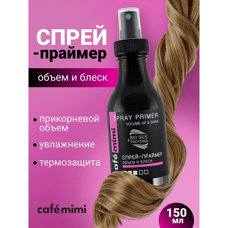 - Спрей-праймер «Объем и блеск» CAFÉ MIMI предназначен для подготовки волос к укладке, создает текстуру и придает волосам прикорневой объем, обладает термозащитным и увлажняющим свойствами.