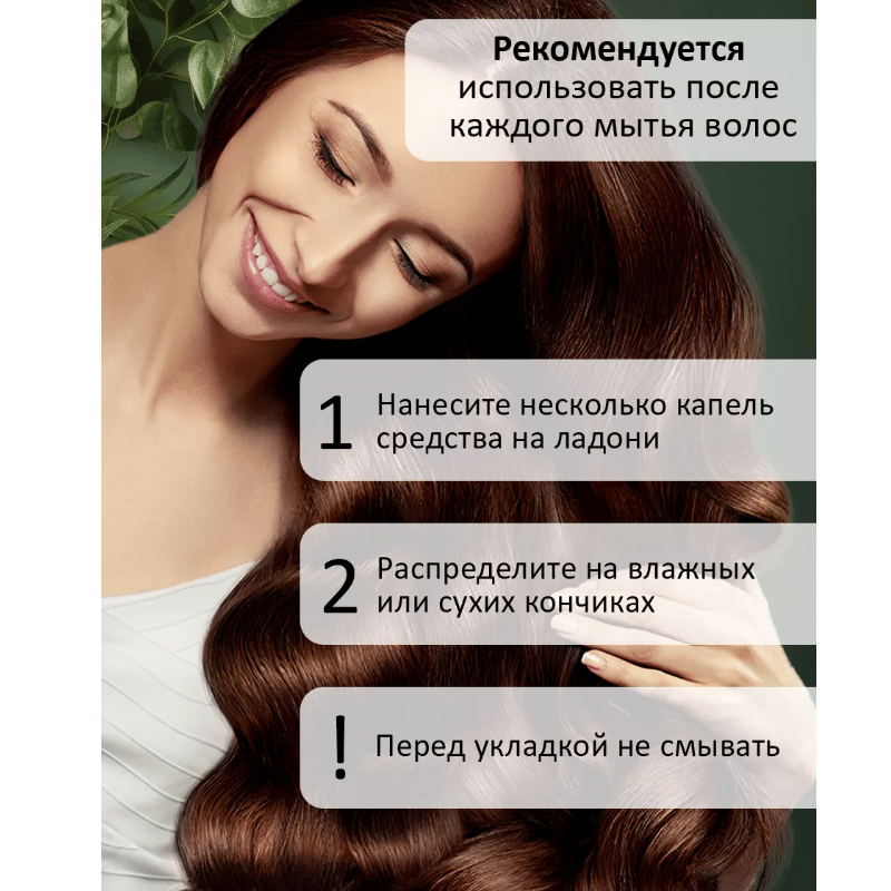 Способ применения: Нанесите несколько капель средства на ладони и равномерно распределите на влажных либо сухих кончиках волос. Перед укладкой волос средство не смывать.