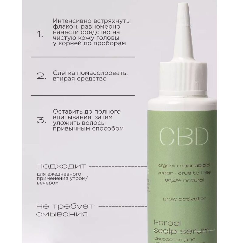 Натуральная формула сыворотки для роста волос с каннабидиолом (CBD) улучшает микроциркуляцию и питание корней волос, стимулируя их естественный рост.